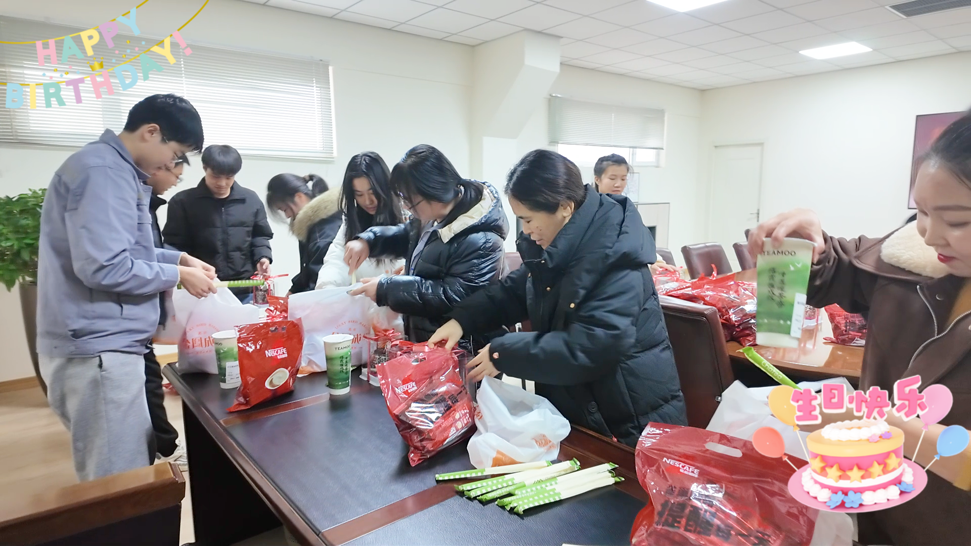 准备了蛋糕和暖心咖啡、奶茶等暖心饮品。